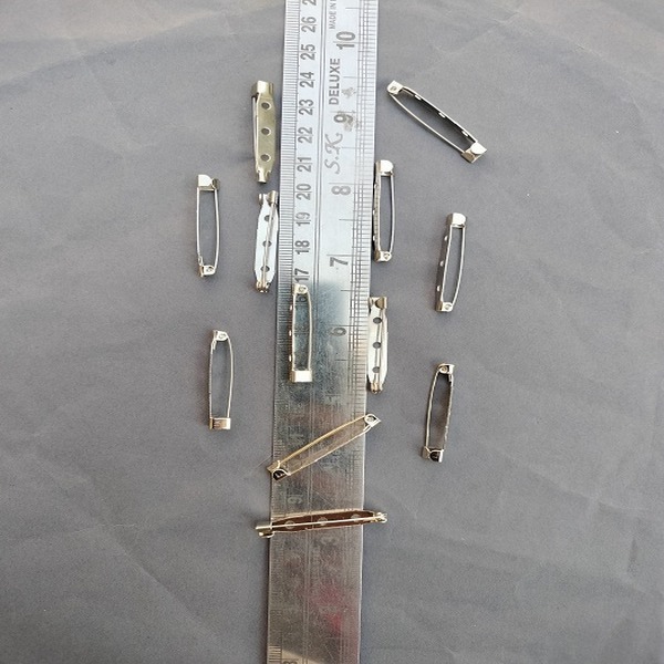 A set of flat metal brooch pin bases with smooth round plates, perfect for gluing or attaching decorative elements such as fabric, beads, or polymer clay creations.